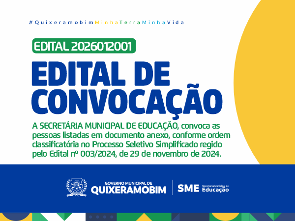 A Prefeitura Municipal de Quixeramobim, por meio da Secretaria do Trabalho e Assistência Social, convoca os beneficiários do Programa Mais Infância para comparecerem ao Banco do Brasil nas datas abaixo especificadas portando RG, CPF e comprovante de residência. para o recebimento do cartão do benefício.