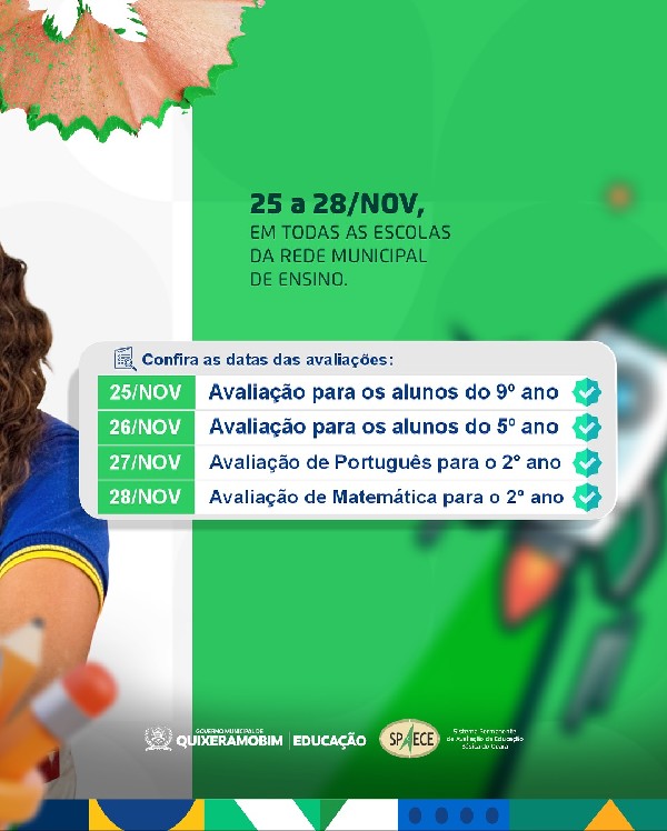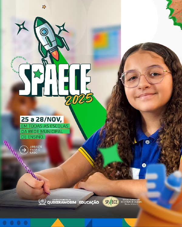 De 25 a 28 de novembro, todas as escolas da Rede Municipal de Ensino participam da aplicação do SPAECE 2025, um momento importante para avaliar a aprendizagem dos nossos estudantes e fortalecer cada vez mais a educação do nosso município.