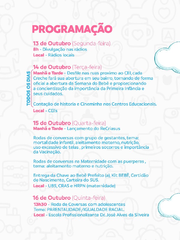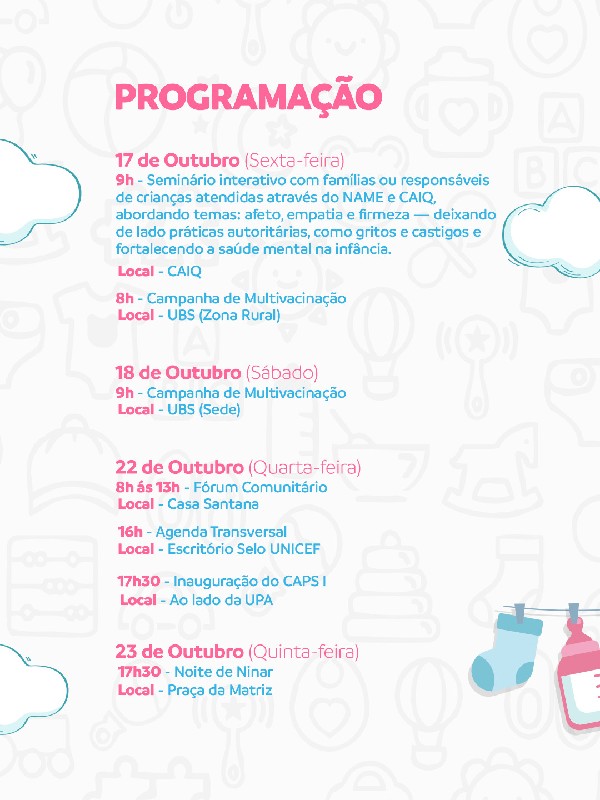 Serão dias de muito aprendizado, afeto e cuidado, com uma programação linda voltada à valorização da primeira infância envolvendo famílias, educadores e toda a rede de proteção à criança.