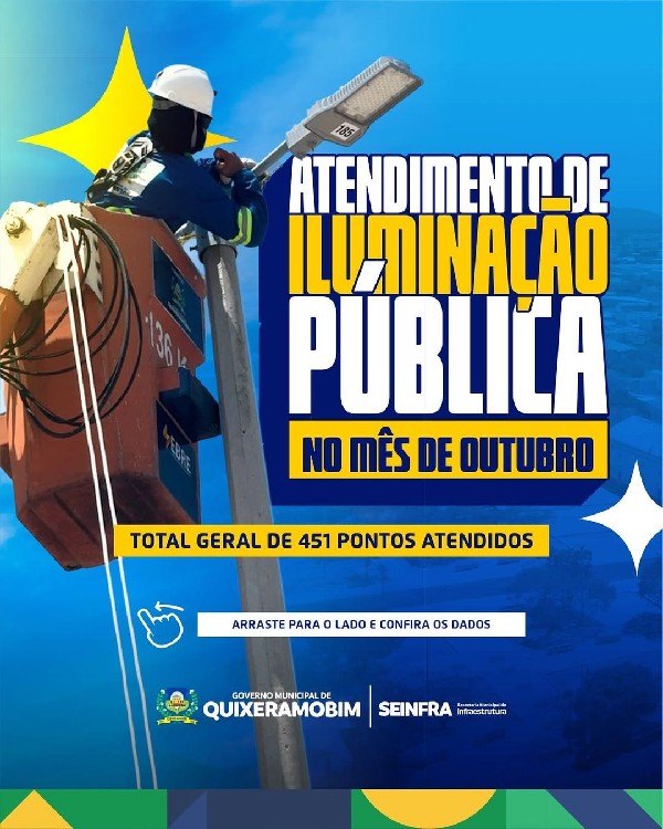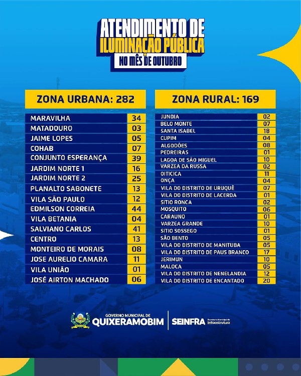 A nossa prestação de contas da iluminação pública de outubro chegou! A Prefeitura de Quixeramobim, através da SEINFRA, trabalhou muito e garantiu a manutenção de 451 PONTOS em todo o município.